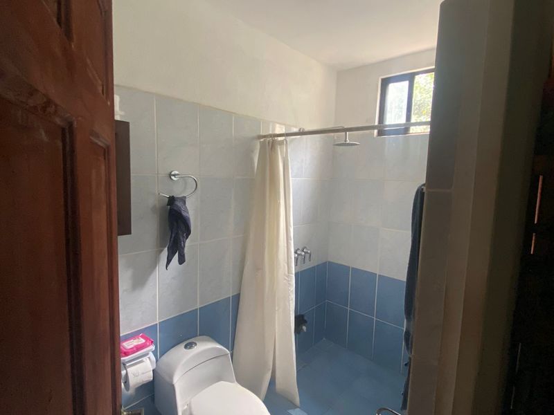 Take the stairs to the second-floor bedroom. The large double windows and sliding glass doors illuminate the room with natural light and is furnished with a queen size bed and large chest of drawers. The blue and gray tiles and classic design of the adjoining bath, creates a beachy feel to wake up to or refresh after a day in the life of a local or visitor to Costa Rica.